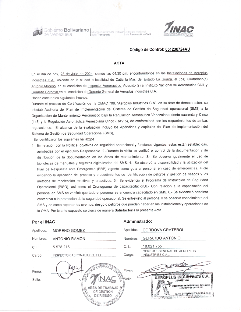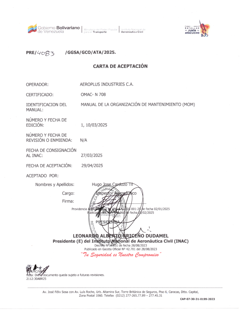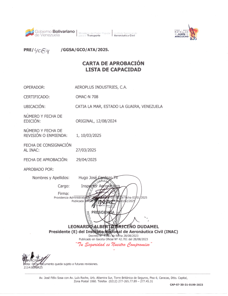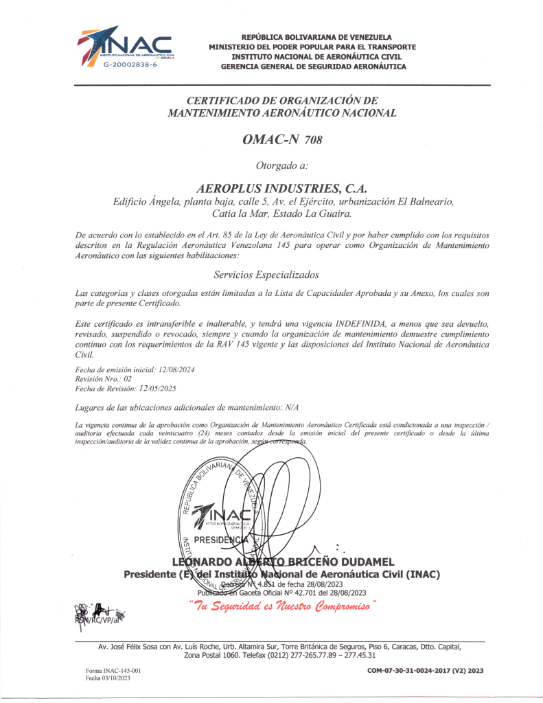 Acceda a los documentos emitidos por la Autoridad Aeronáutica Venezolana (INAC) que certifican a Aeroplus Industries C.A. como OMAC-N 708.