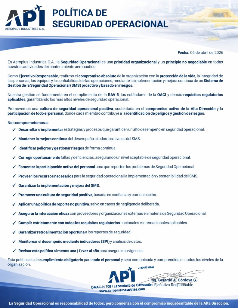 Acceda a los documentos clave de nuestro Sistema de Gestión de Seguridad Operacional (SMS), incluyendo políticas firmadas por el Gerente Responsable y aprobaciones emitidas por los entes de certificación.